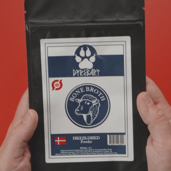 Vores Bone Broth pulver - Lam, fungerer som en værdifuld kilde til essentielle næringsstoffer, der understøtter din hunds led, hud og pels. Den kan anvendes som en lækker tilføjelse til deres daglige kost eller som en smagsforstærker i deres foder.