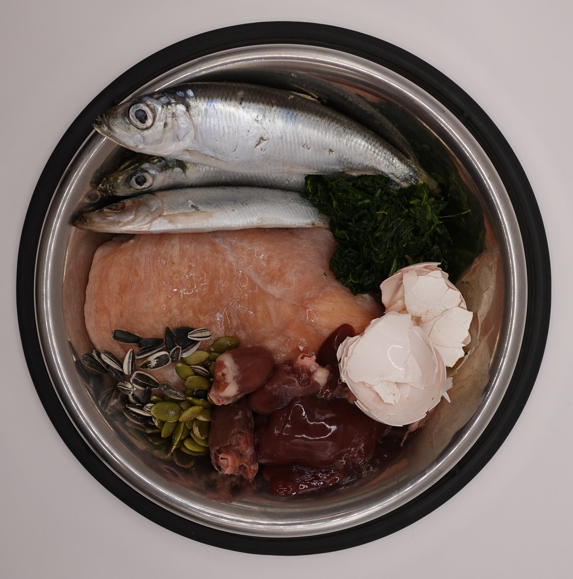 Hakket Kylling (45%), Sild (15%),, Kyllingelever (10%), Æg (6%), Kyllingehjerter (4 %),Solsikkekerner (6%)græskarkerner (6%) Spinat (2-3 %), Salt (<1%) , Zink (<1%), Tang (<1%), Calcium (<1%)